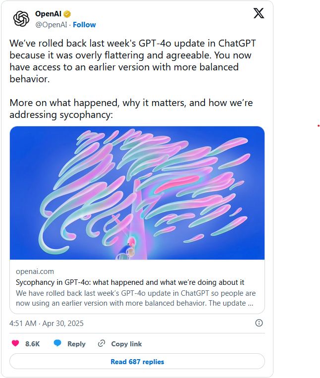 Es algo bien sabido por los usuarios y que se ha estado reclamando a la compañía. Tanto es así que, este pasado 30 de abril, tuvieron que desactualizar el modelo porque era demasiado halagador y complaciente.